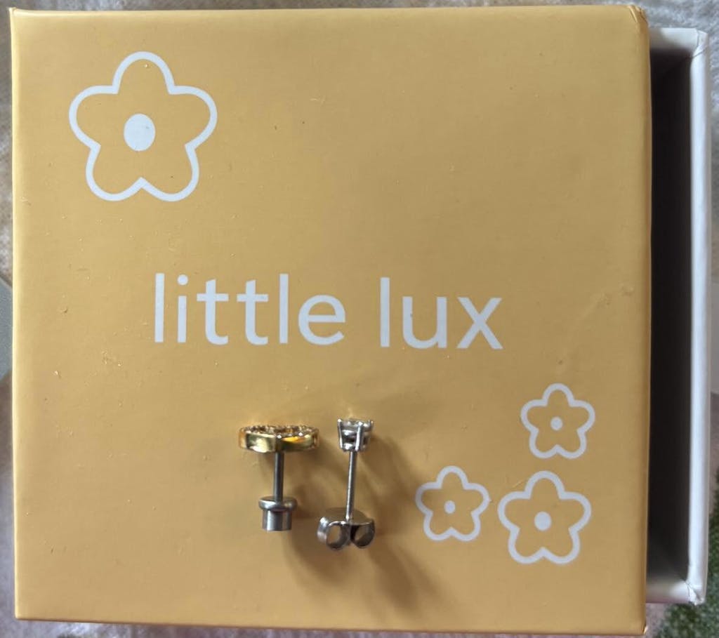 I had high hopes for these - they are absolutely adorable, but the posts are super short and also thicker than standard post earrings, so pay attention to that if you're considering these! Could not get them through my 6 year old's ear lobes (there was lots of crying involved) so had to return them before she could wear them a single time. here you can see the tini lux stud on the left, and the standard one I already owned from another company, on the right.
