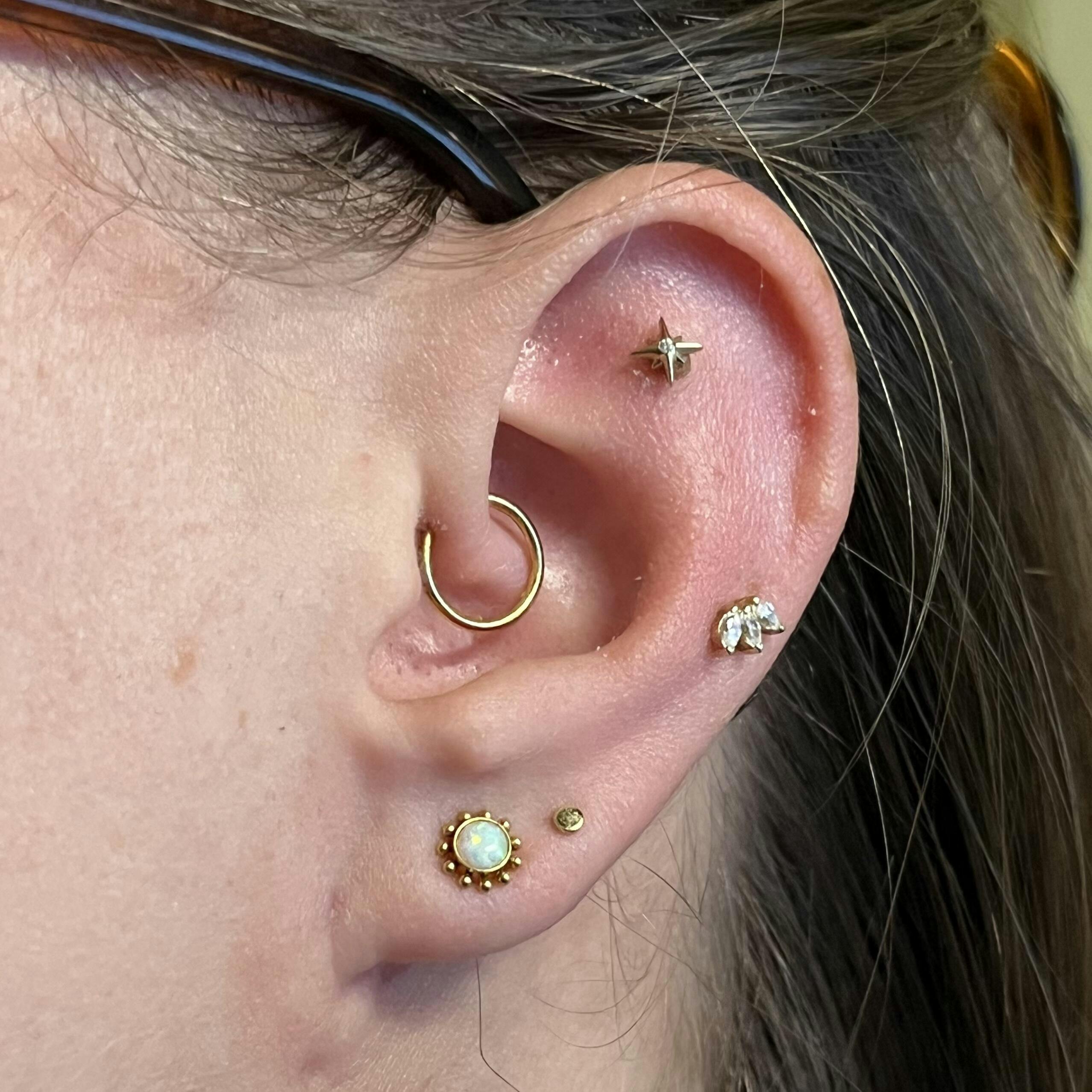 I love this earrng, its great and is a wonderful anchor for an earring stack. Super cute and comfortable! I’ve been wearing it in a piercing that was not healing and was really sensitive, so far this stud hasn’t been irritating and I can sleep in it no problem.